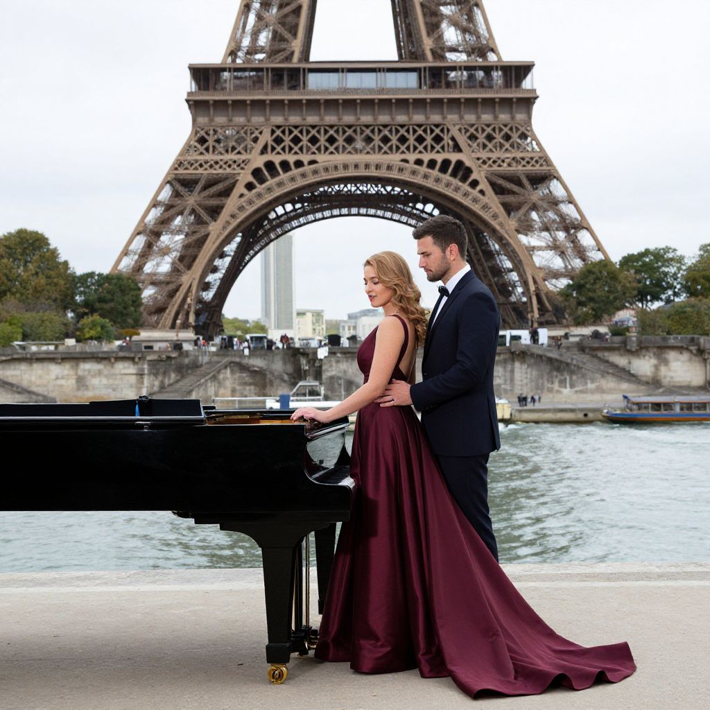 Elegant couple stands by a grand piano, with the man in a dark suit facing the woman in a flowing burgundy gown, set against the iconic backdrop of the Eiffel Tower and the Seine River in Paris.