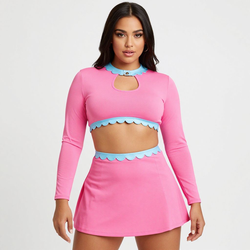 Photograph of a young woman with medium brown skin and long black hair standing against a plain white background. She is wearing a bright pink, long-sleeve, crop top and matching mini-skirt, both adorned with light blue scallop-edged details around the neck and waist. The top has a keyhole cutout at the chest. She has a confident expression, with dark eyeliner and nude lipstick. Her physique is curvy with a toned midsection. She is looking directly at the camera. The overall style is modern and playful.