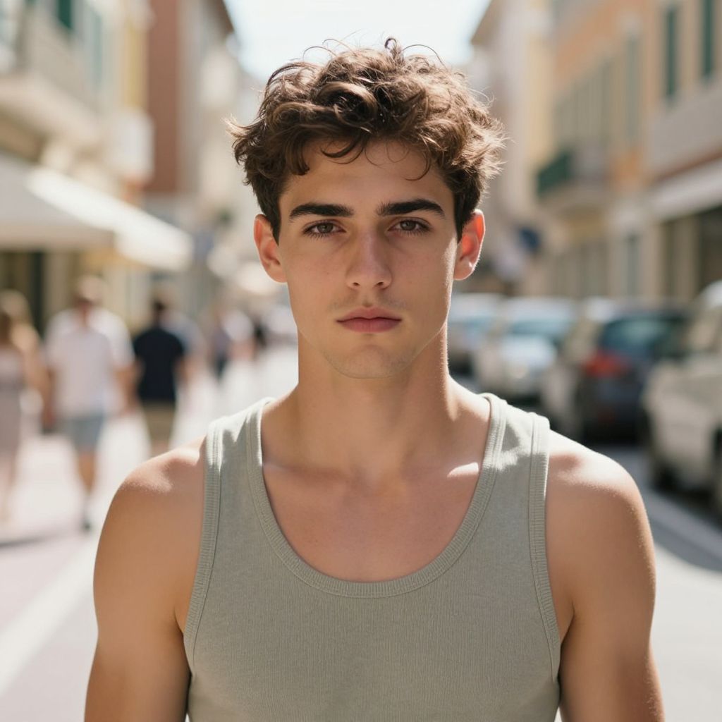 Twunk, fashionable young man with a toned body, dressed in casual streetwear with a leather jacket, walking through a bustling market filled with colorful stalls and diverse crowds, warm lighting, cinematic angle, realistic textures.