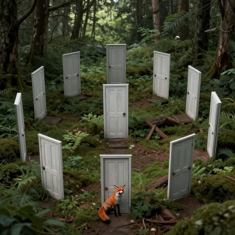 A forest made entirely of doors grows in a circle around a silent screaming fox, each door leading to a different worldly paradox.
