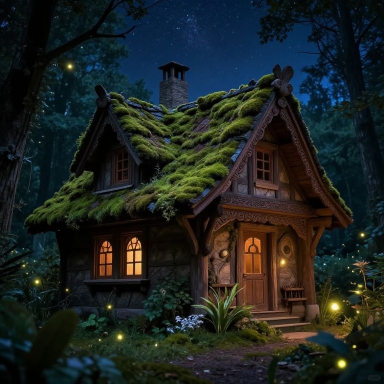 Magical, moss-covered cottage with glowing windows nestled in a starlit forest, surrounded by twinkling fireflies and illuminated by soft, yellow lights.