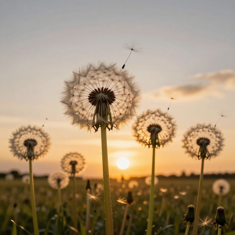 Giant dandelion clocks stand tall against a golden sunset, their seeds whispering stories of freedom and transience as the warm breeze carries them toward an unknown horizon.