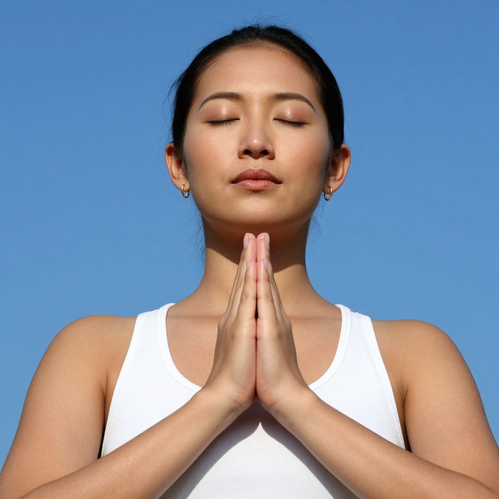 Serene Asian woman with closed eyes performing Namaste mudra gesture, hands pressed together in prayer position, wearing a white tank top and gold earrings, set against a vibrant blue sky backdrop.