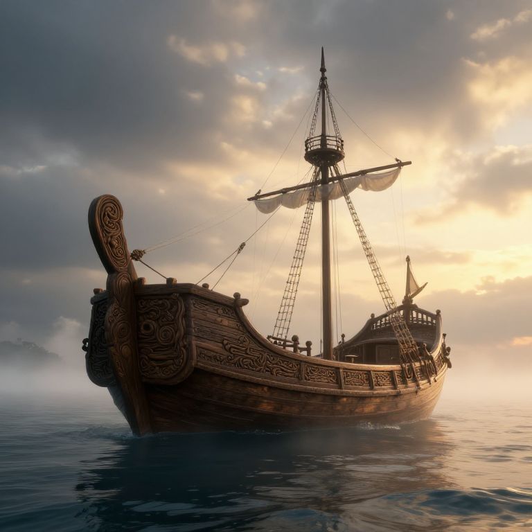 Noae floating on a mystical ocean at dawn, ancient wooden ship with intricate carvings, soft golden light illuminating misty waters, dramatic cloudy sky, fantasy maritime adventure scene, detailed textures, cinematic atmosphere