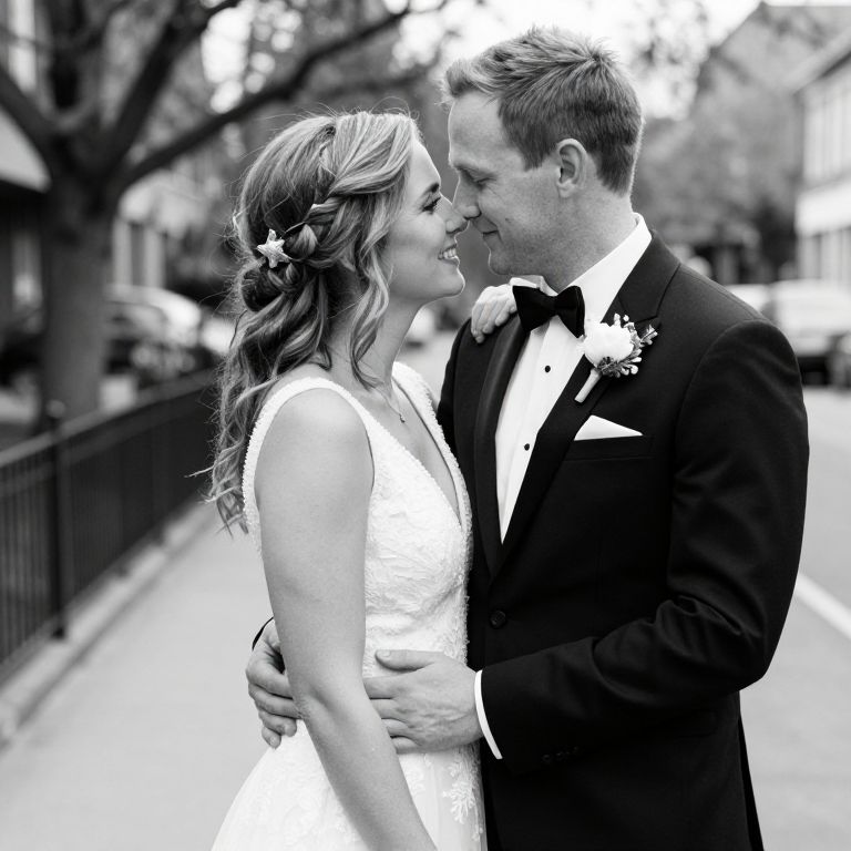 Black and white photograph of a bride and groom embracing on a city street. The bride wears a sleeveless lace wedding dress with styled hair adorned with a flower, and the groom is dressed in a classic black tuxedo with a bow tie and boutonniere. The couple is gazing lovingly into each other's eyes.