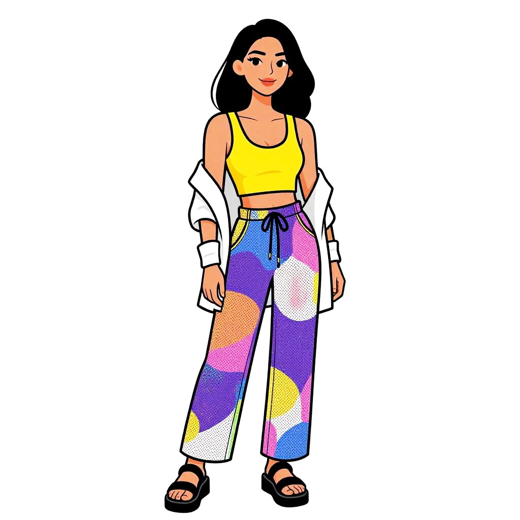 This is a digital illustration of a young woman with medium-length black hair, wearing a bright yellow sleeveless crop top, white unbuttoned shirt, and high-waisted, wide-legged pants with a vibrant, multicolored abstract pattern in purple, pink, blue, and yellow. She stands confidently, with her arms relaxed by her sides, and wears black sandals. The background is plain white, making the bold colors of her outfit stand out. The illustration style is reminiscent of pop art, with thick outlines and a dot pattern adding texture to the clothing.
