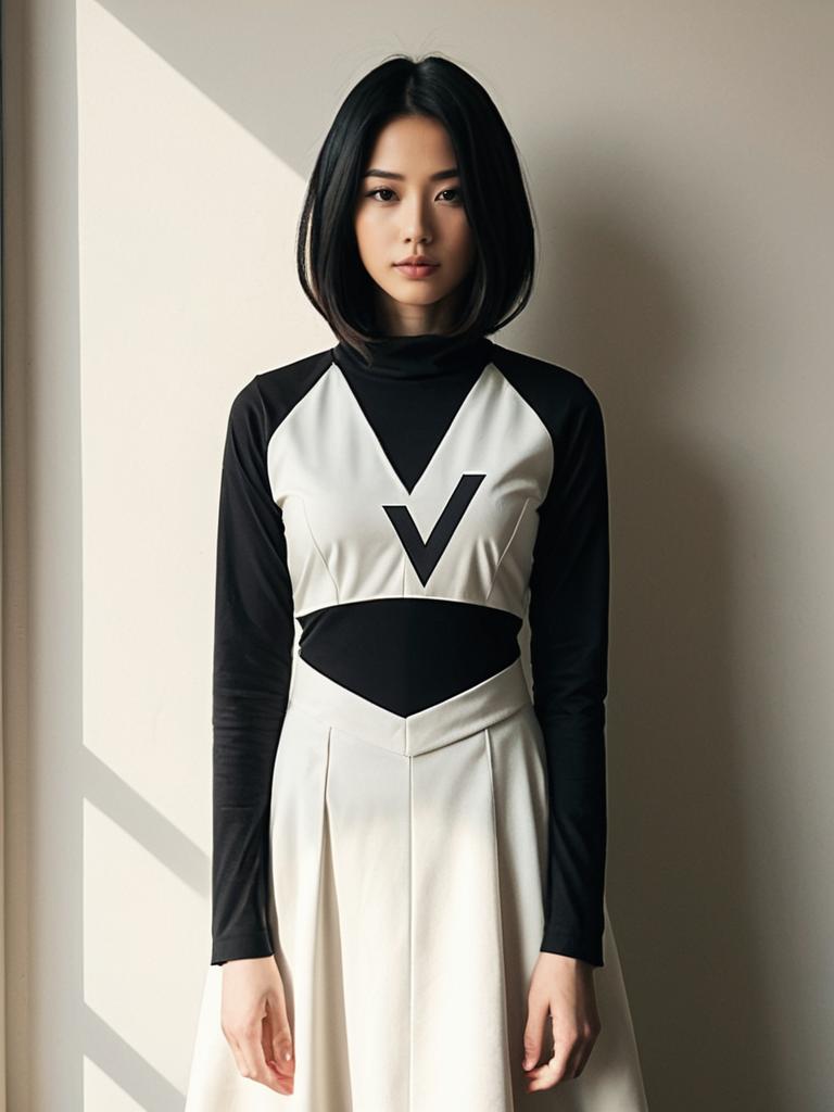 Portrait of an Asian woman with straight black hair, wearing a black and white Serial Designation V cosplay costume. The outfit features a high-neck black underlayer with long sleeves and a white sleeveless top with a prominent black 'V' design on the chest, paired with a white pleated skirt. The photo is taken indoors with natural lighting creating soft shadows.