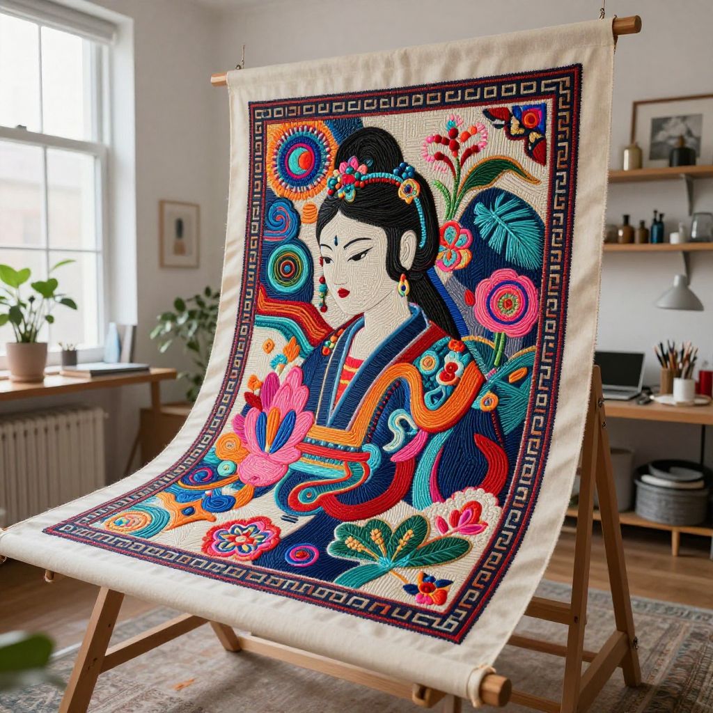 Artistic AI designing an intricate tapestry that combines traditional art forms with digital motifs, detailed embroidery textures mixed with neon highlights, set in a cozy, modern artist's studio illuminated by natural light.