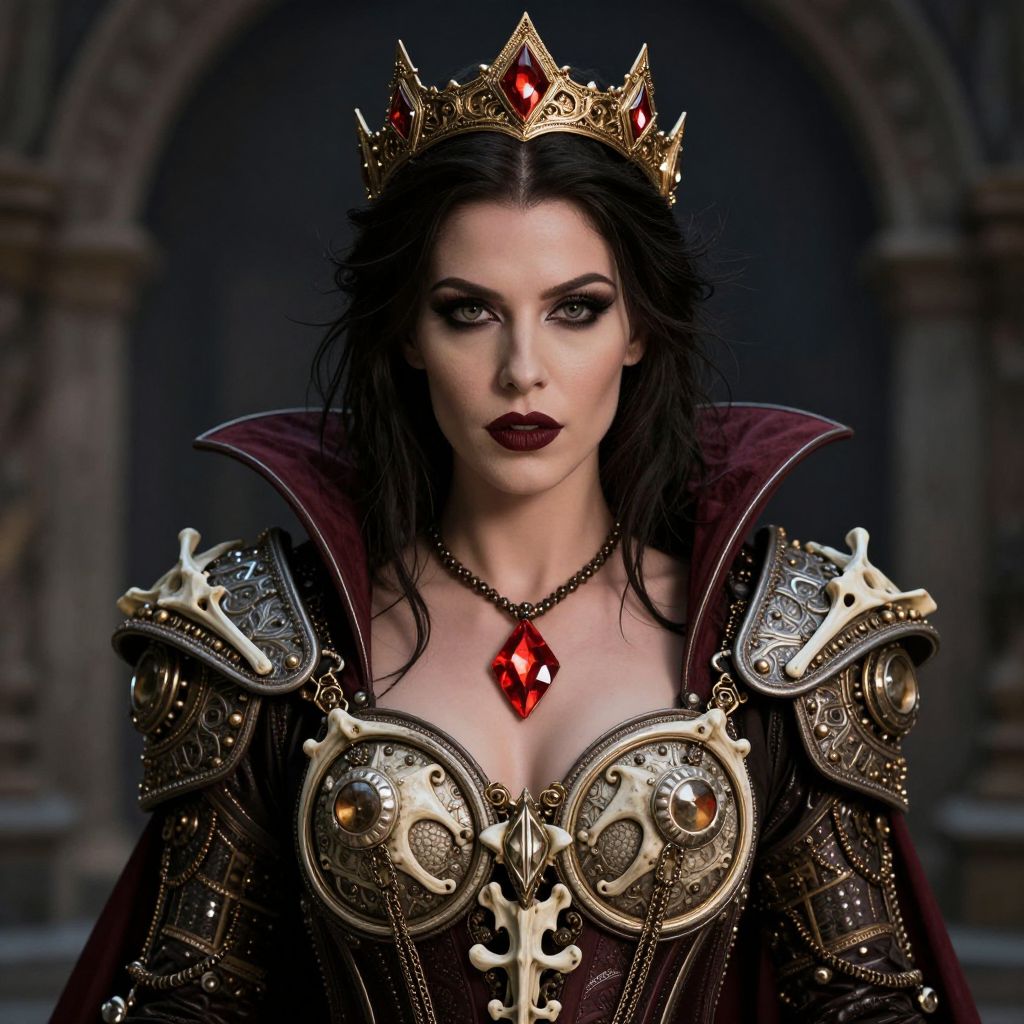 A beautiful necromancer woman in ornate armor adorned with bones, a golden crown, and a shimmering necklace featuring a glowing red diamond.