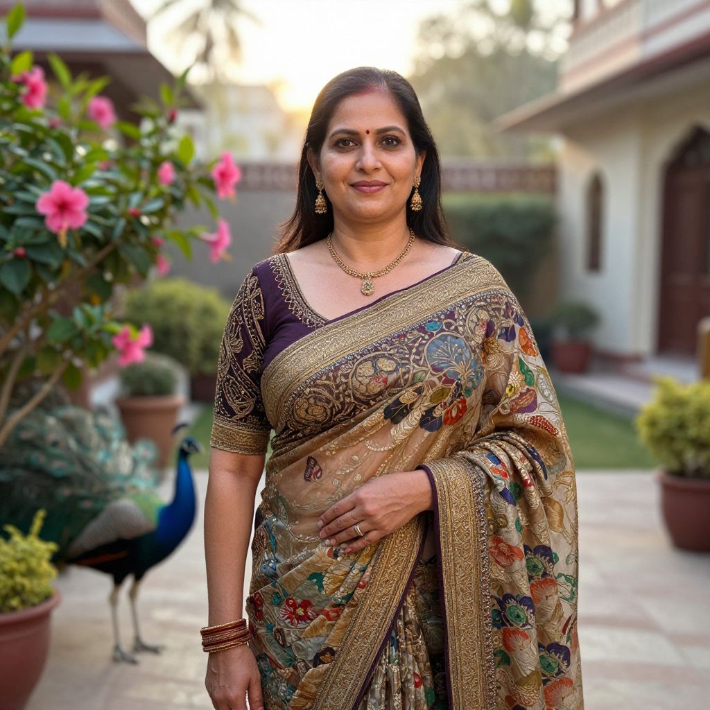 Photograph of a middle-aged Indian woman with medium brown skin and dark brown hair, wearing a gold and brown traditional saree with intricate embroidery and colorful floral patterns. She has a gold necklace and matching earrings, and her right hand is gently holding her saree. She stands in a sunny garden with pink flowers, a blue peacock in the background, and a white house with red trim on the right. The background is slightly blurred, focusing attention on the woman. She has a calm, confident expression.