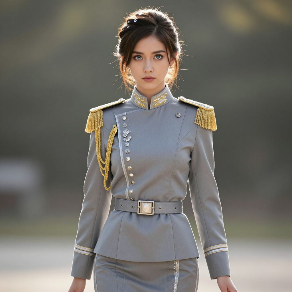 In this stunning full-body portrait, a young woman exudes an air of elegance and strength, donning a meticulously detailed grayish military officer uniform that speaks volumes of her dedication and pride. The uniform, adorned with intricate gold and silver embellishments, features a high collar and epaulettes, adding to its regal appearance. The woman's fair skin complements her striking features, including her large, reflective eyes and a stern expression that hints at her unwavering resolve. Her hair, styled in an elegant updo, is accented with sequins, further enhancing her glamorous look. She stands confidently, her posture dynamic and poised, with a belt cinching her waist, accentuating her slender figure. The sunlight filters through, casting a warm glow and highlighting the textures and details of her attire. The background, though blurred, suggests a natural setting, providing a serene contrast to the woman's commanding presence. The overall composition is masterfully crafted, with each element carefully positioned to create a harmonious and visually captivating scene.