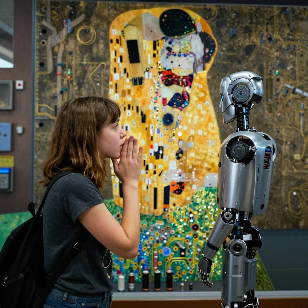 Photograph of a woman with brown hair, black shirt, and backpack, gazing at a silver robot against a vibrant Gustav Klimt-style
