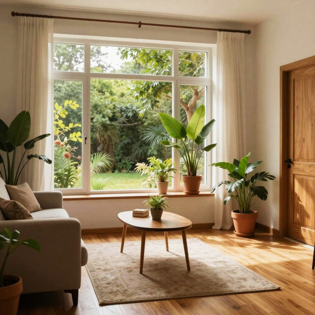 A serene indoor garden area featuring a large tree surrounded by various green plants, enclosed by tiled walls. The garden is visible through wooden-framed sliding glass doors in a modern, minimalistic indoor space with smooth tiled flooring.