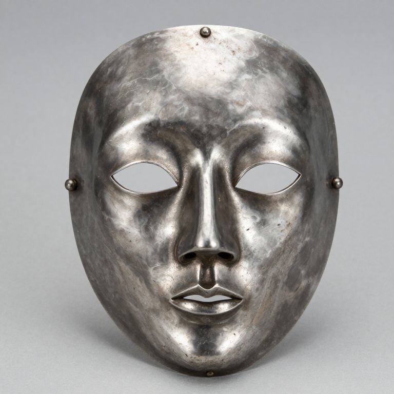 Photograph of a metallic, silver-colored mask with a smooth, slightly reflective surface. The mask has a rounded, oval shape with a symmetrical, stylized face featuring almond-shaped eyes, a straight nose, and downturned lips. The metallic texture shows subtle, cloud-like patterns. Four small, round rivets are evenly spaced around the mask's edges. The background is a plain, light gray gradient, highlighting the mask's shiny, reflective quality. The mask's design is minimalistic and abstract, with a modern, almost futuristic aesthetic.