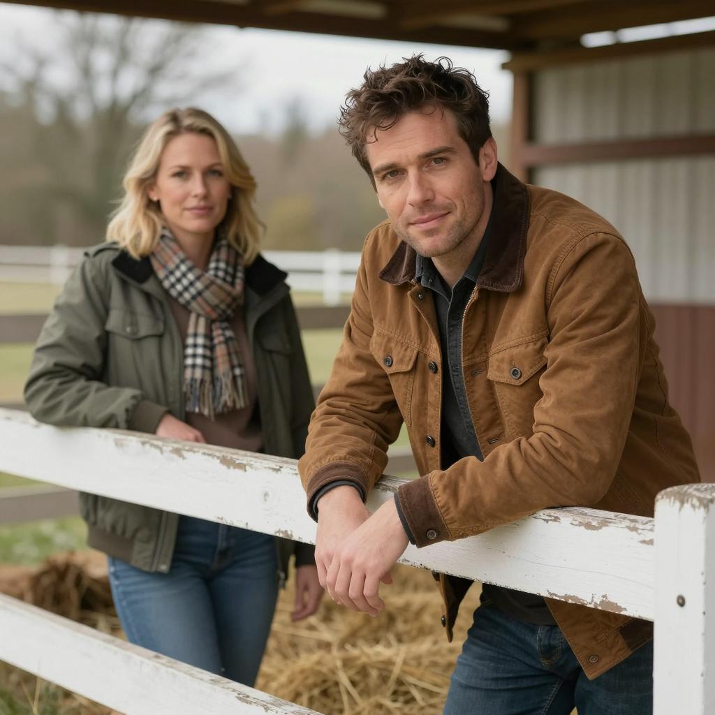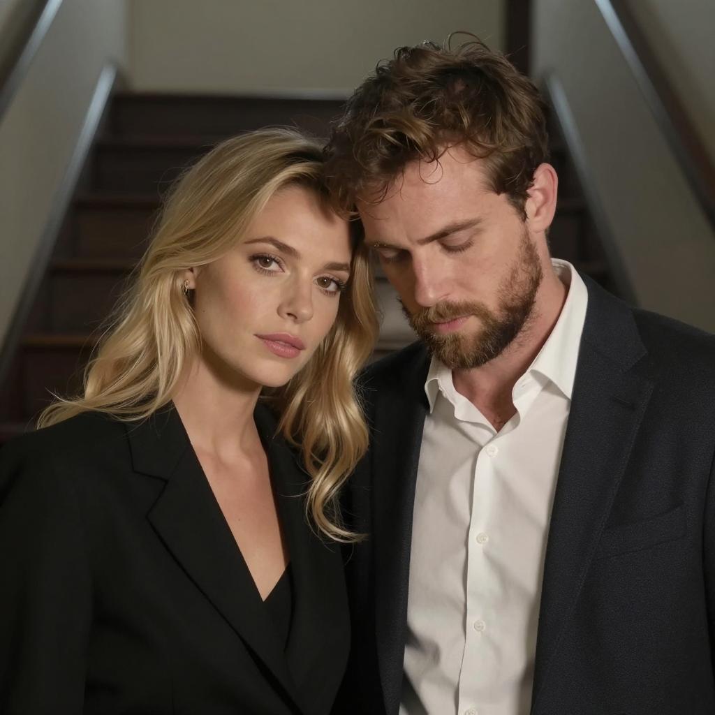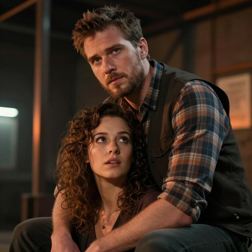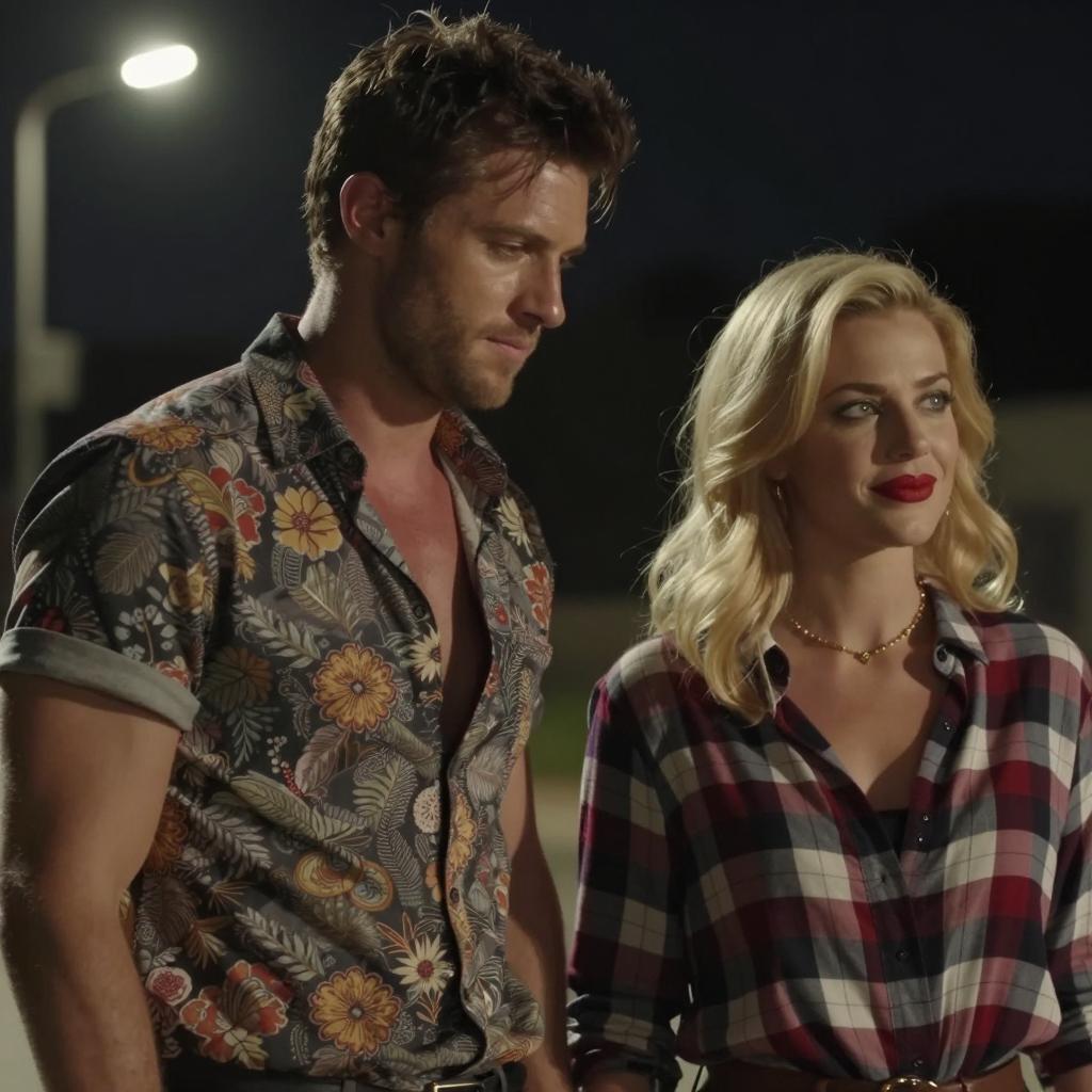 Man with dirty brown shirt and black leather jacket stands in doorway, blonde woman in black tank top stands close behind him. Both look concerned. Nighttime background with old car and trees. Number "5" on door. Woman's hand on man's chest.