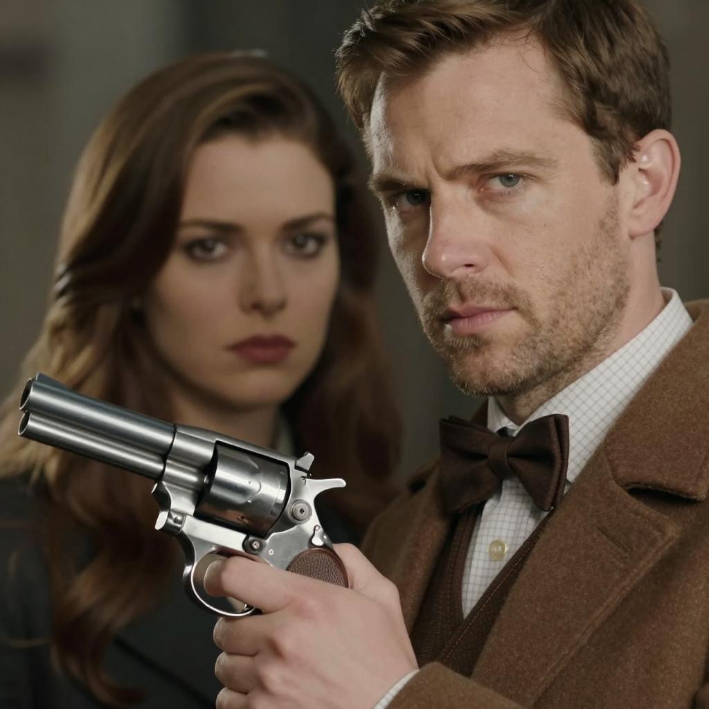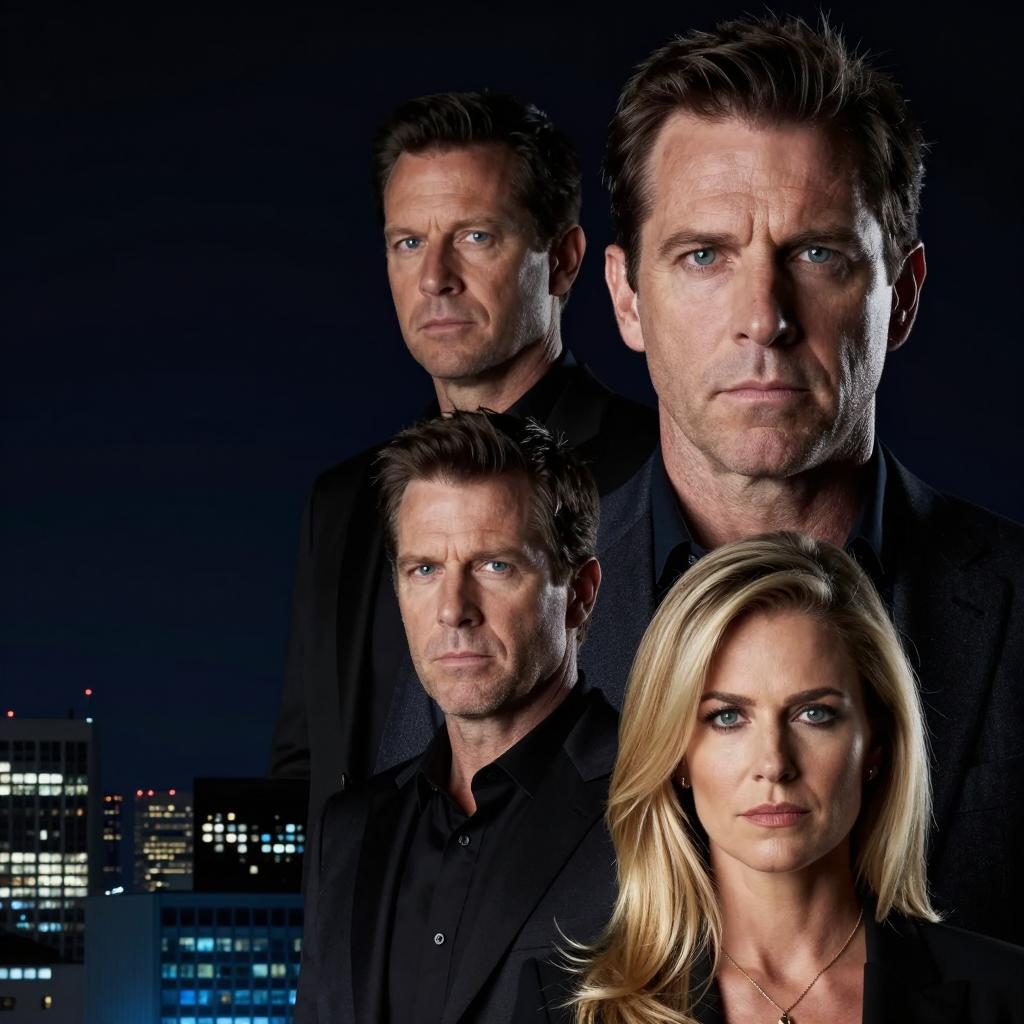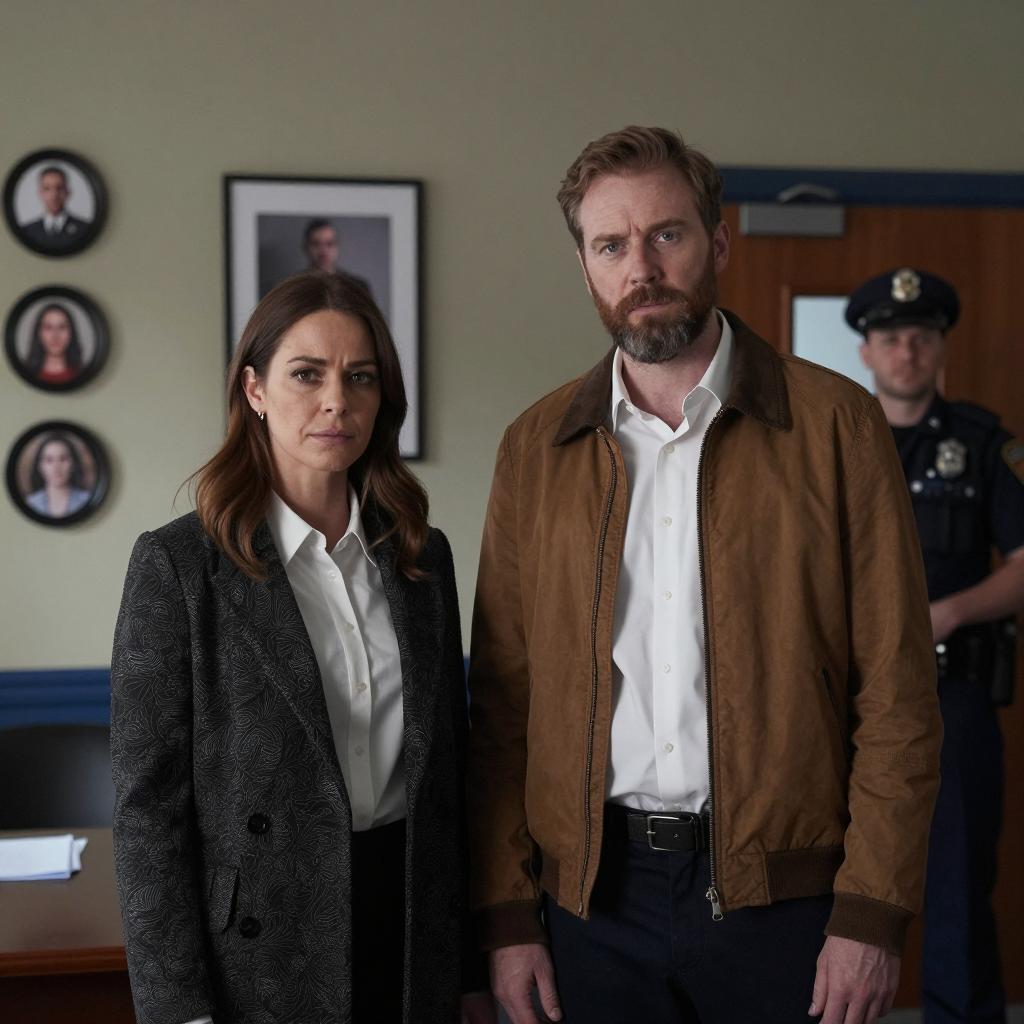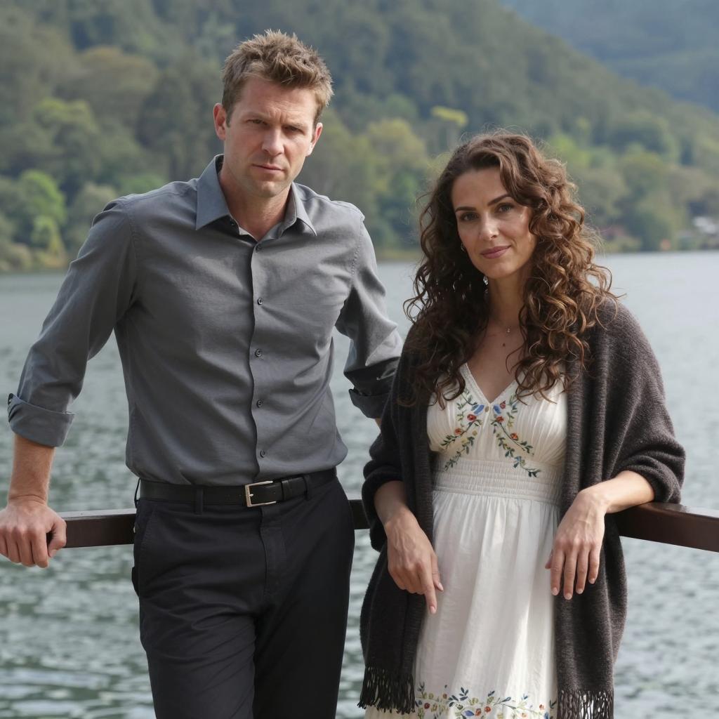 Man with dirty brown shirt and black leather jacket stands in doorway, blonde woman in black tank top stands close behind him. Both look concerned. Nighttime background with old car and trees. Number "5" on door. Woman's hand on man's chest.