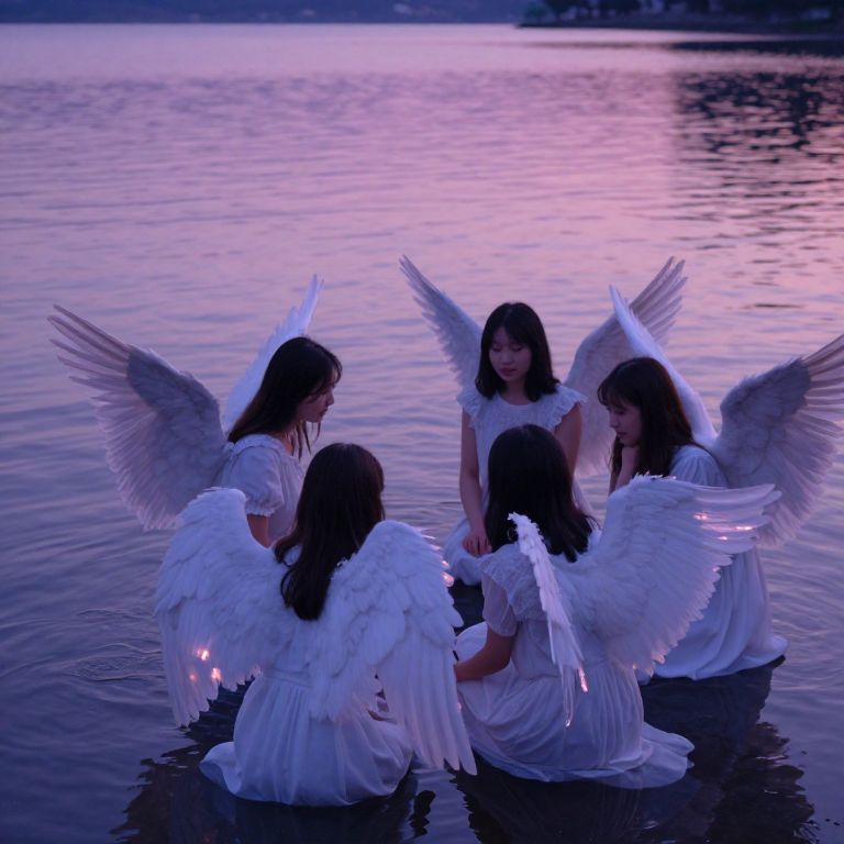 Real.angels gathering around a peaceful lake at twilight, bathed in soft purple and pink hues, wings reflecting the shimmering water, gentle expressions of compassion and serenity, serene atmosphere, finely detailed with an emphasis on light and shadow balance, ethereal beauty