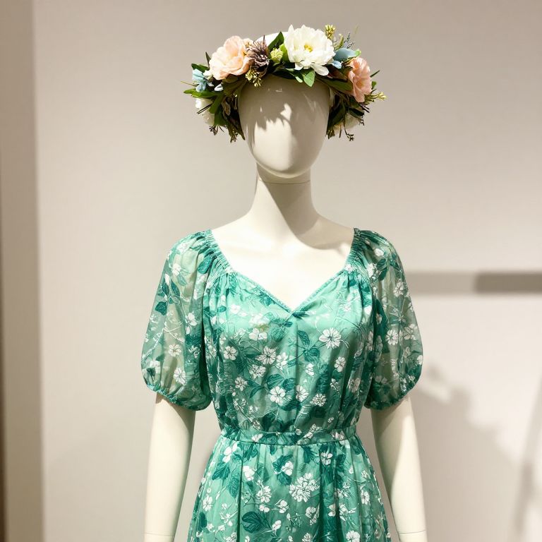 Mannequin wearing a green floral print dress with a wreath of flowers on her head.