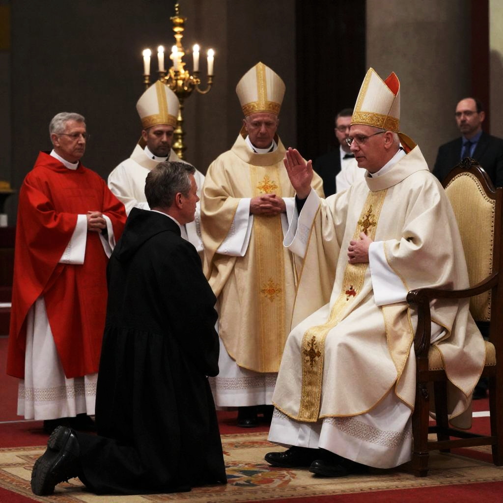 Photograph of a ceremonial gathering in a grand, dimly-lit hall. Several clergy members in ornate robes and hats stand and kneel around a seated bishop in elaborate white and gold vestments. Candles and a chandelier in the background. Bishop's intense gaze at kneeling man. Clergy in red and black robes. Bishop's right hand raised. Dark stone walls and heavy drapery. Bishop's chair on right. Group of men in background, partially obscured. Bishop's left hand resting on armrest.