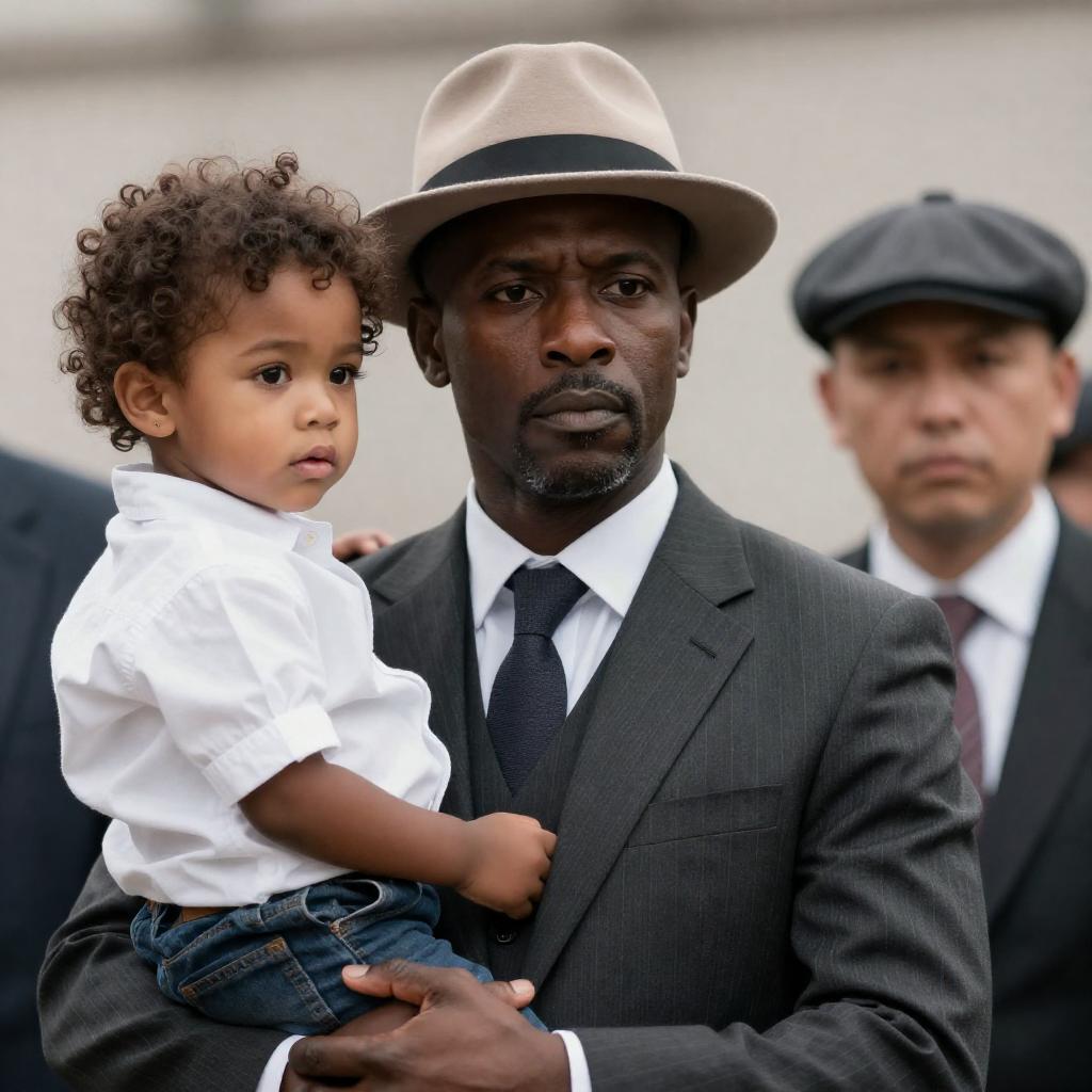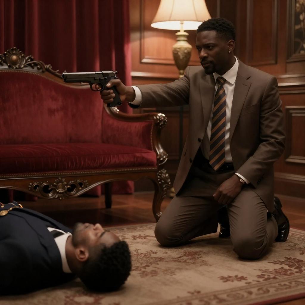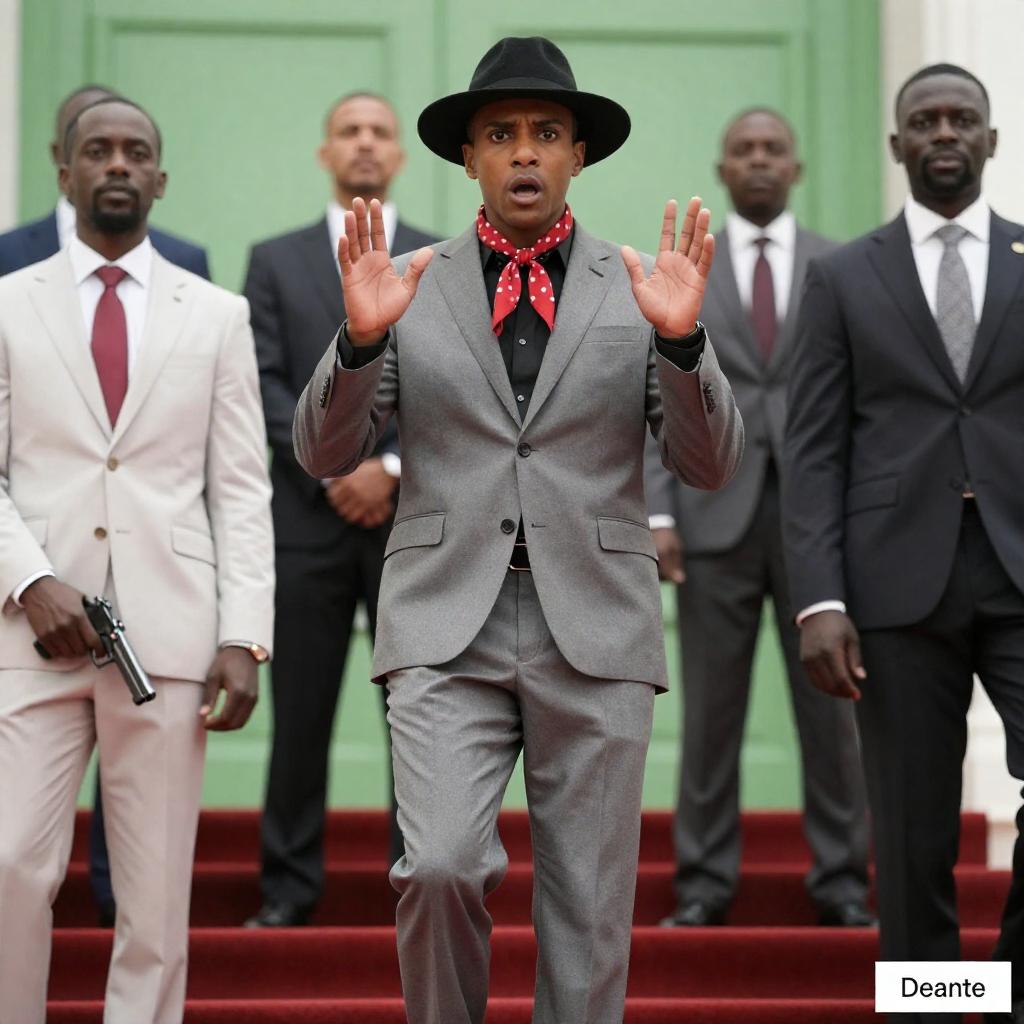 Photograph of a man in a gray suit and black hat with a red polka dot scarf, hands raised, startled, walking up a staircase. Another man in a white suit and red tie, holding a gun, stands on the left. Multiple men in suits and ties in the background, blurred. Bright green walls, red carpeted stairs. Label in the bottom right corner.