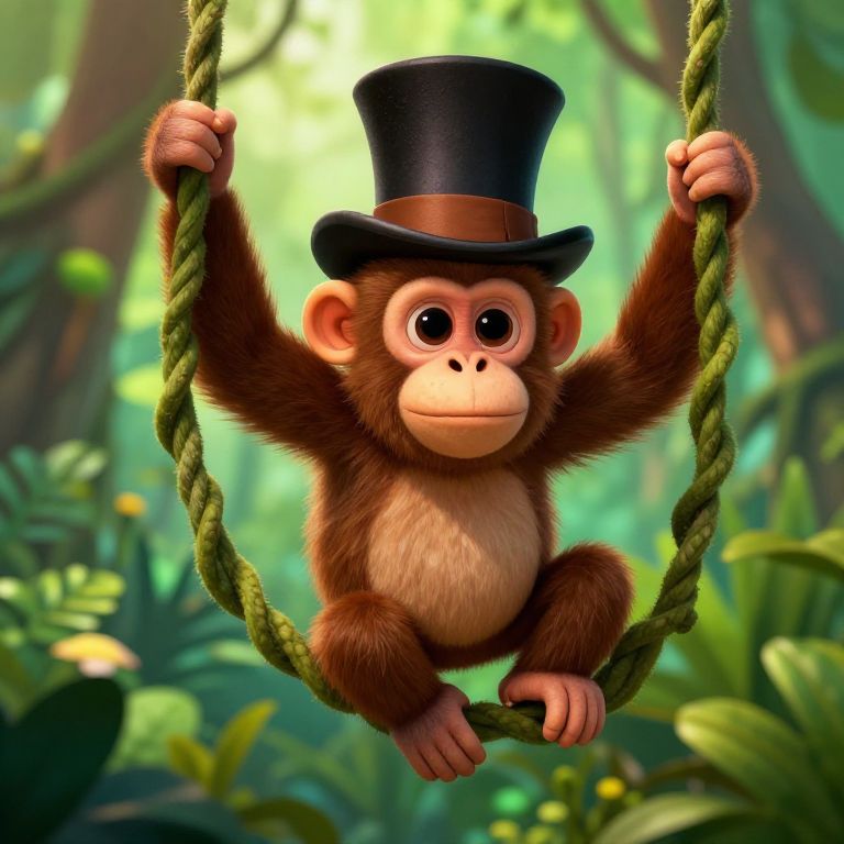 CGI image of a cute, brown-furred baby monkey wearing a black top hat, swinging on a green rope in a lush, sunlit jungle