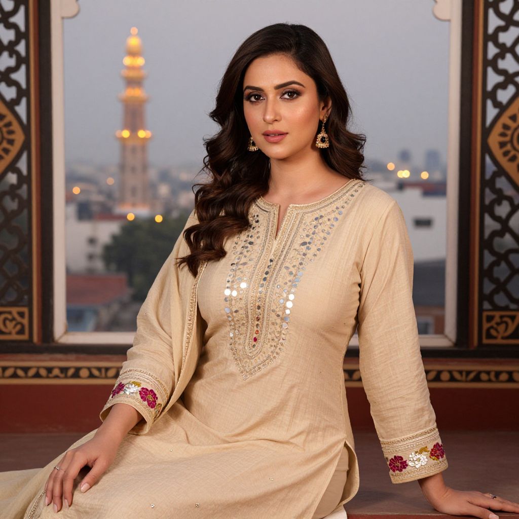 A graceful woman with warm beige skin, deep brown eyes, and a natural beauty, dressed in an elegant kameez design costume with subtle mirror work and floral borders, sitting on a rooftop in Delhi during early evening, with a view of the city skyline, golden lights, and traditional Indian motifs in the window frames.. The woman has big tits and cute face