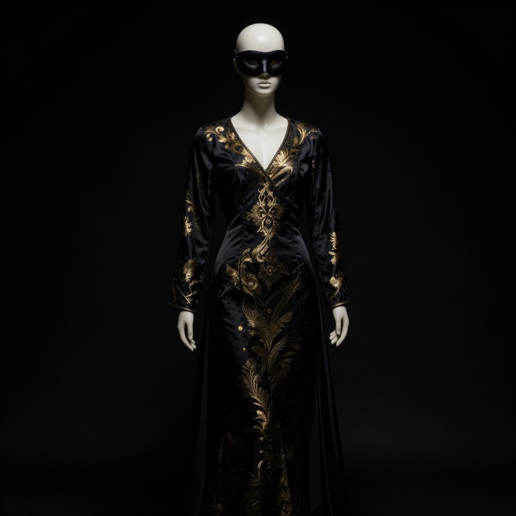 A mannequin with a black mask and a black outfit with gold accents, standing in a dark, mysterious setting, with a seductive and enigmatic aura, wearing a black mask that covers the upper half of the face, the outfit is made of sleek black fabric with intricate gold patterns, the mannequin's pose is statuesque and elegant, with a mysterious and alluring presence, the overall atmosphere is dark and mysterious, enhancing the enigmatic and seductive nature of the mannequin.