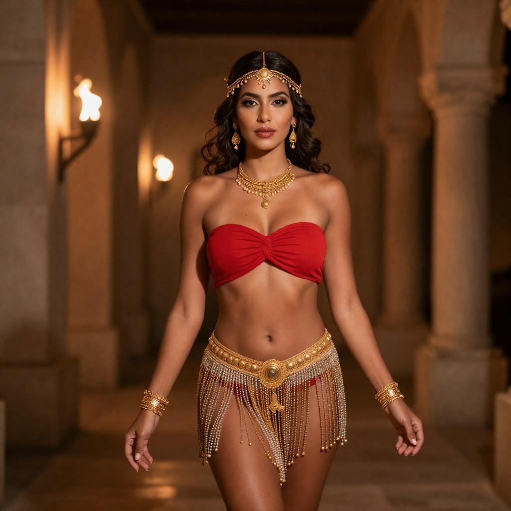 Woman with light brown skin, wearing a red bandeau top, gold necklace, and beaded pants, standing in a dimly lit, stone-columned corridor. Gold jewelry and headpiece adorn her. Warm torchlight illuminates the background. She stands confidently, arms slightly out.