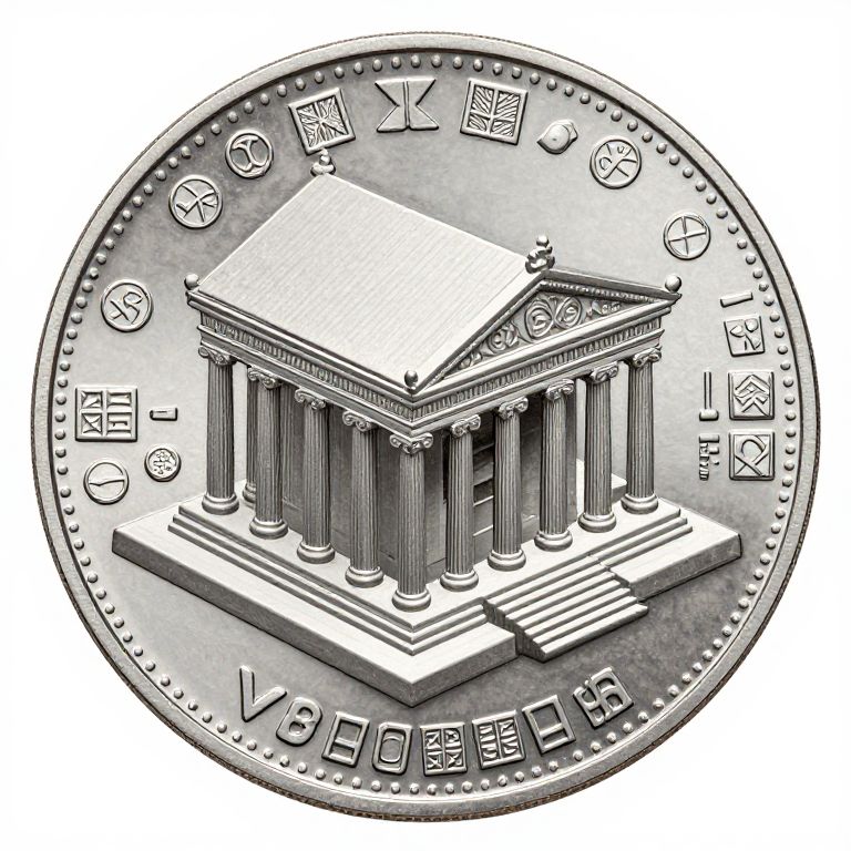 The image showcases an intricately designed silver coin with a 3D isometric art style. The coin features a grand architectural structure at its center, resembling a classical temple with columns and a pediment, set on a raised platform. Surrounding the central structure are various engravings and symbols, including coins, geometric patterns, and inscriptions. The coin's surface is highly detailed, with raised textures and shadows adding depth and realism. The overall composition is balanced, with the architectural element positioned centrally, drawing the viewer's attention. The coin's design elements are carefully arranged, creating a harmonious and visually engaging piece.
