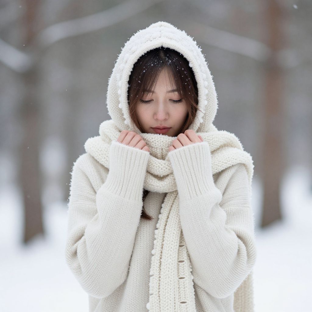 Photograph of an Asian woman with fair skin and dark hair, standing in a snowy forest. She wears a thick, white, knitted hooded coat and matching scarf, with her hands gently clutching the scarf around her neck. Her eyes are closed and her expression is serene. Snow is gently falling, and the blurred background features snow-covered trees. The overall color palette is white and gray, emphasizing the cold, wintry atmosphere. The texture of the knitted coat and scarf is prominent, adding a sense of warmth and coziness against the snowy backdrop.