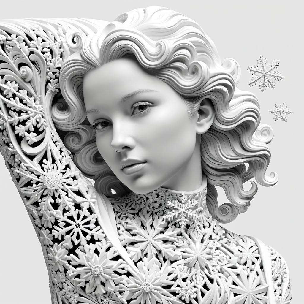 A beautiful white female 3D sculpture against a white background, whimsical snowflakes fused throughout the sculpture, Antonio Canova style of hyperrealism, very intricate details, abstract vector fractal, wave function, zentangle, 3D shading