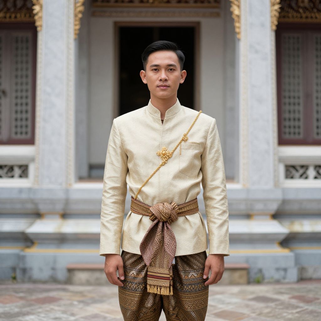 Photograph of an Asian man in traditional Thai attire: cream long-sleeve shirt, brown patterned pants, gold sash, standing in front