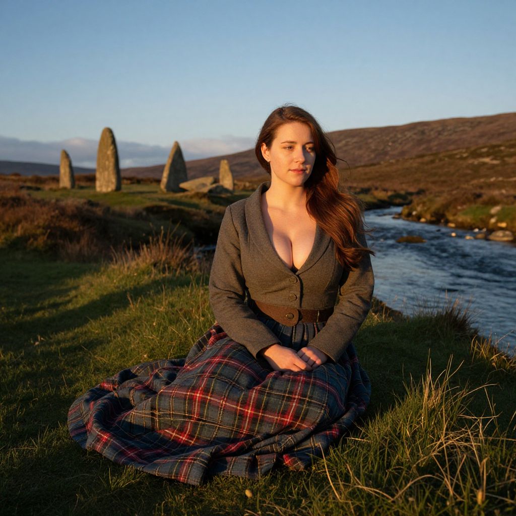 A naturalistic photo of a serene Scottish Highland woman in a flowing tartan skirt and a belted jacket, sitting by a river at sunset on a remote Highland moor, her face is soft with a calm expression, long auburn hair flowing over one shoulder, the golden light casting long shadows across the grass and standing stones.. The woman has big tits and cute face