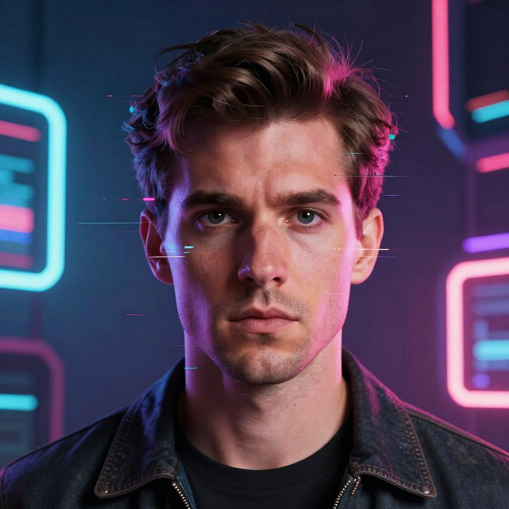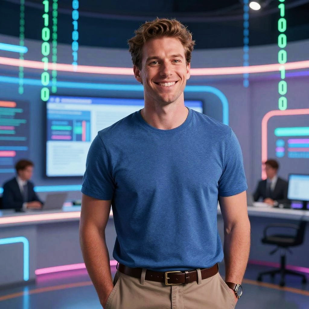 Ben Shapiro AI generated image in a digital art style, surrounded by floating binary code, futuristic newsroom setting, vibrant colors, dynamic lighting, striking and vivid composition