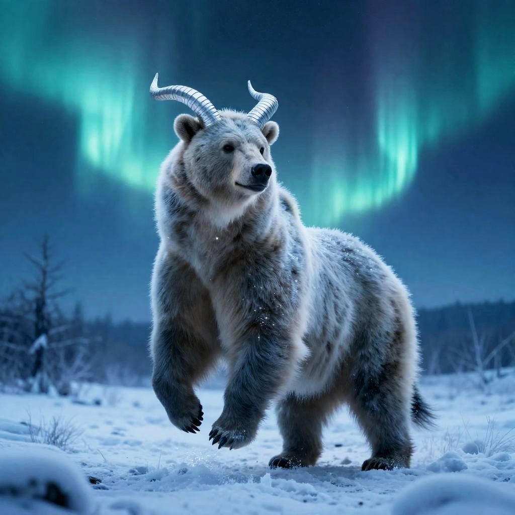 A majestic centaur-bear with flaming claws and silver feathers, rearing up in a mystical forest with floating orbs of light, with golden sunset rays.