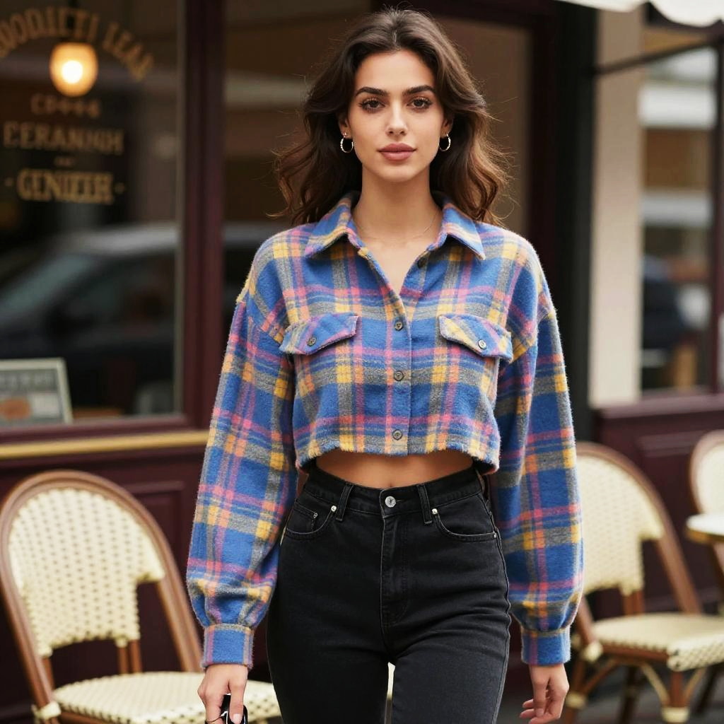 A woman in casual streetwear, wearing a cropped plaid flannel shirt in blue, yellow, and pink with long sleeves and black high-waisted jeans, stands at a French Cafe with vintage decor, captured in a shogakukan visual style. Sexy. Pretty face and beutiful eyes