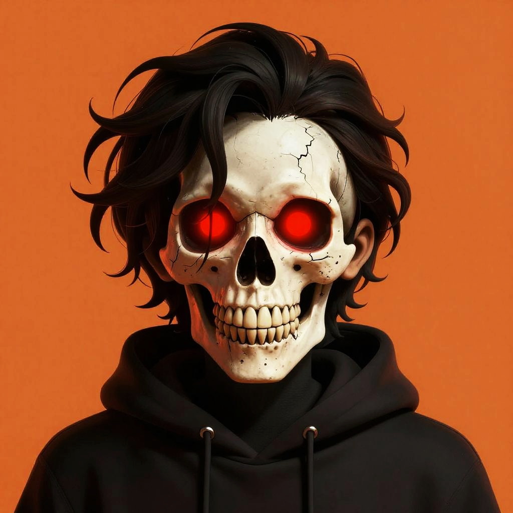 Digital artwork of a creepy, skeletal female figure with a pale blue-green skull, black eye sockets, and a toothy grin. She has blonde hair tied in a messy bun, secured with a yellow hairband, and wears a black jacket. Black drips run down her chin, and she's set against a bright yellow background with white cross-like patterns. The style is vibrant and edgy, with bold colors and sharp contrasts.