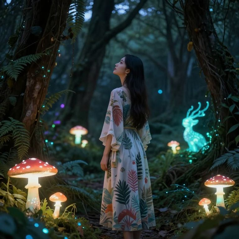 Enchanted forest scene: woman in floral dress gazes up, surrounded by glowing mushrooms and fireflies, with a blue ethereal light in background