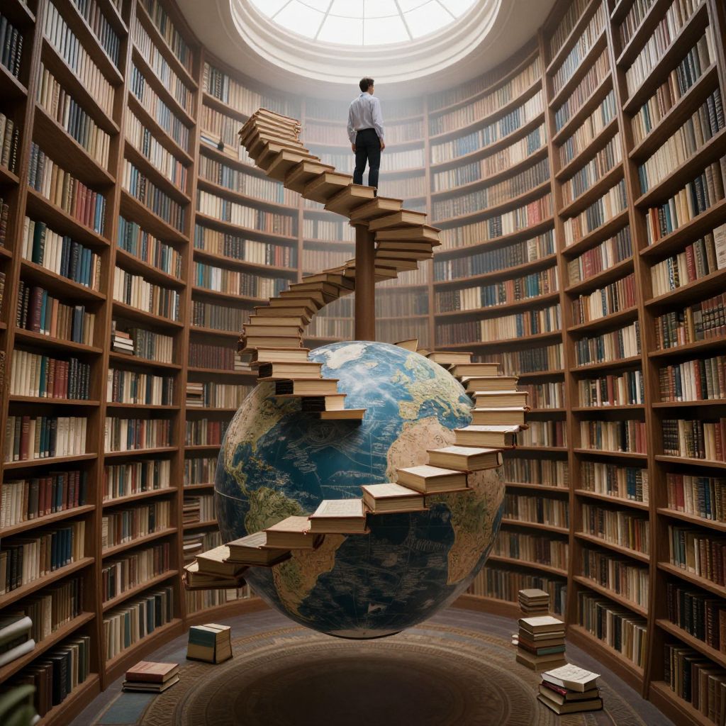 Five men in business attire ascend a towering staircase composed entirely of intricately layered sheets of musical notation, each step resonating with unique tones and rhythms as they climb toward the summit.