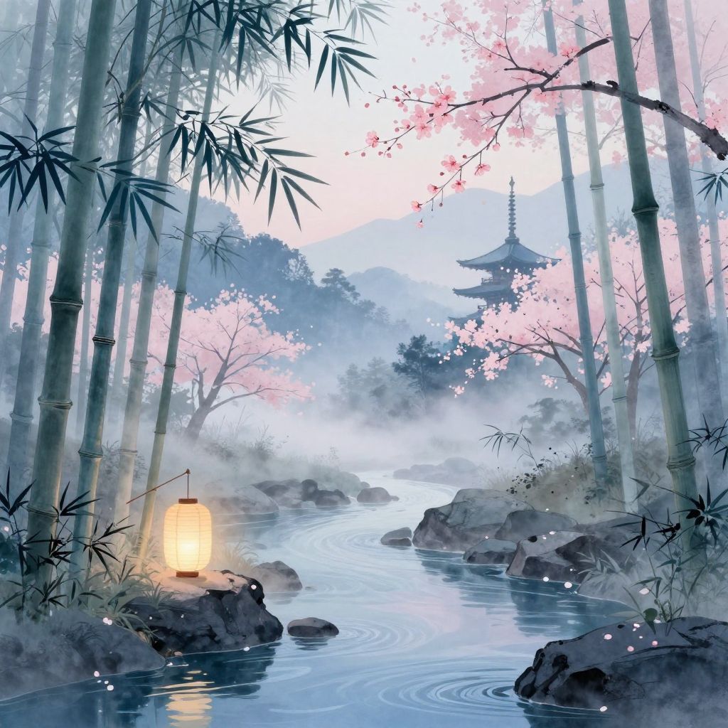 Digital artwork of a serene bamboo forest at twilight, featuring softly glowing lanterns hanging near the rocks by a calm stream. The scene includes gentle fog and mist, sakura blossom branches in pastel pink, and distant traditional Japanese pagodas on misty, forested cliffs. Rendered in a modern minimalist sumi-e style with a color palette of pastel blues and pinks, blending coastal wave and sakura blossom patterns for a tranquil and atmospheric composition.