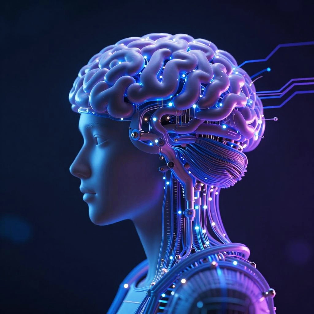 Stable diffusion AI, an artistic fusion of human brain and machine parts connected by flowing circuits and glowing fibers, immersive 3D render with high contrast lighting, deep blues and purples dominating the color palette, symbolizing AI evolution and knowledge spread.