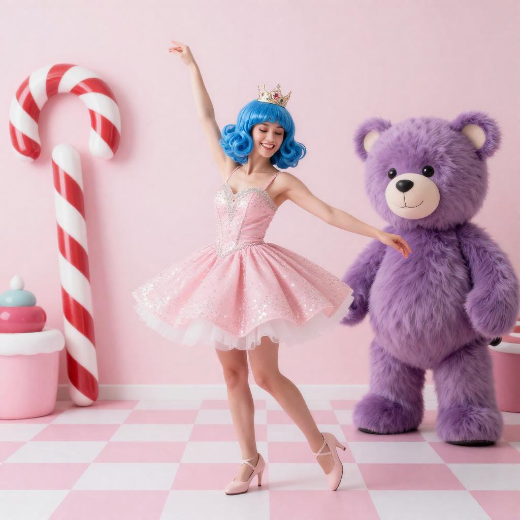 Woman in pink, sparkly dress with blue wig and crown, dancing with purple furry bear in a candy-themed set. Pink and white checkered floor, large candy canes, pastel background, both smiling. Woman in center, bear to the right.