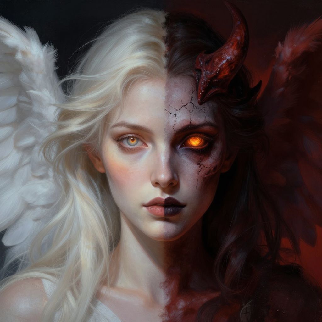 This digital painting depicts a strikingly beautiful, ethereal woman with a dual nature. Her face is split down the center: the left side has pale, almost white skin with long, flowing platinum blonde hair, and white angelic wings. The right side is dark, with cracked, red skin, fiery orange eyes, and a prominent red horn. The background is a gradient of dark blues and blacks, enhancing the contrast between her two sides. Her expression is neutral, with subtle pink lips. The painting uses a realistic yet fantastical style, with intricate details and a high level of contrast between light and dark elements.