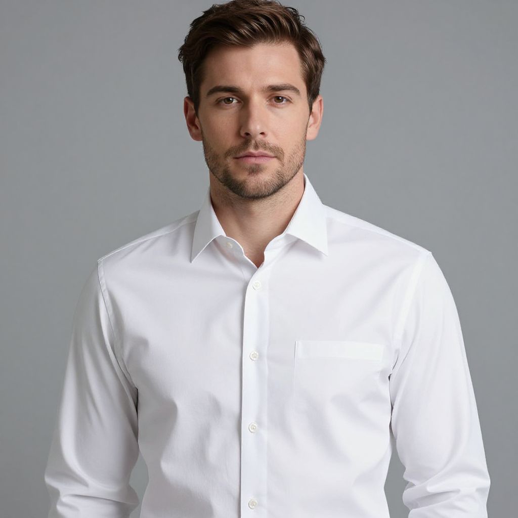Male custom dress shirt, 1boy, male focus, solo, shirt, realistic, grey background, white shirt, facial hair, looking at viewer, upper body, simple background, closed mouth, collared shirt, brown hair, breast pocket, pocket