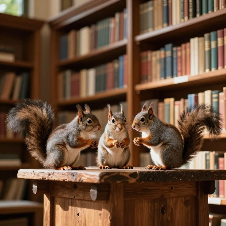Photograph of three grey squirrels with bushy tails, sitting on a wooden table in a library. The squirrels are facing each other, two on the left and one in the center, all holding small pieces of food. The background features tall, wooden bookshelves filled with books of various colors and sizes. The warm, natural light illuminates the squirrels and the table, highlighting their grey and white fur. The image captures a cozy, serene atmosphere with a focus on the playful squirrels amidst the quiet, scholarly setting.