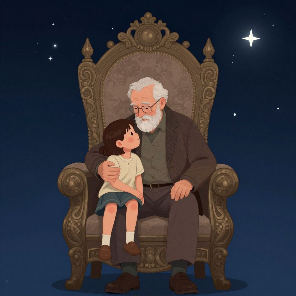 A heartwarming digital illustration captures an older man and a young child enjoying a serene moment together in a sunlit field, playfully interacting with floating bubbles under golden-hour lighting.