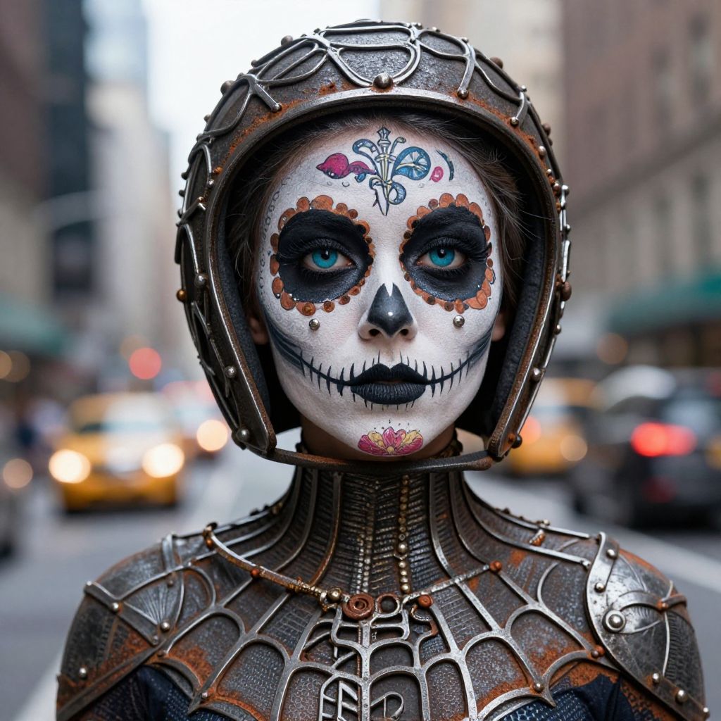 Photorealistic, best quality, concept art, hyper detailed, photo of indian man, la catrina, face paint, tattoo, no helmet, ((light bokeh)), intricate, (steel metal [rust]), elegant, sharp focus, photo by greg rutkowski, soft lighting, vibrant colors, (masterpiece), ((streets)), (detailed face)+, eye iris, trending on artstation, unreal engine, 8k, uhd, studio photo, traffic, new york, full frame, beautiful legs, dark background, round frame, in frame