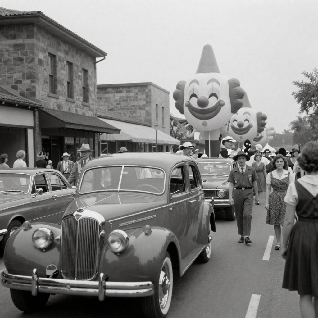 Black-and-white photograph of a bustling street parade. Old-fashioned car in foreground, crowd of people in 1940s clothing, large inflatable clown heads in air, stone buildings with shops in background, daytime, people looking forward, cars parked on street.