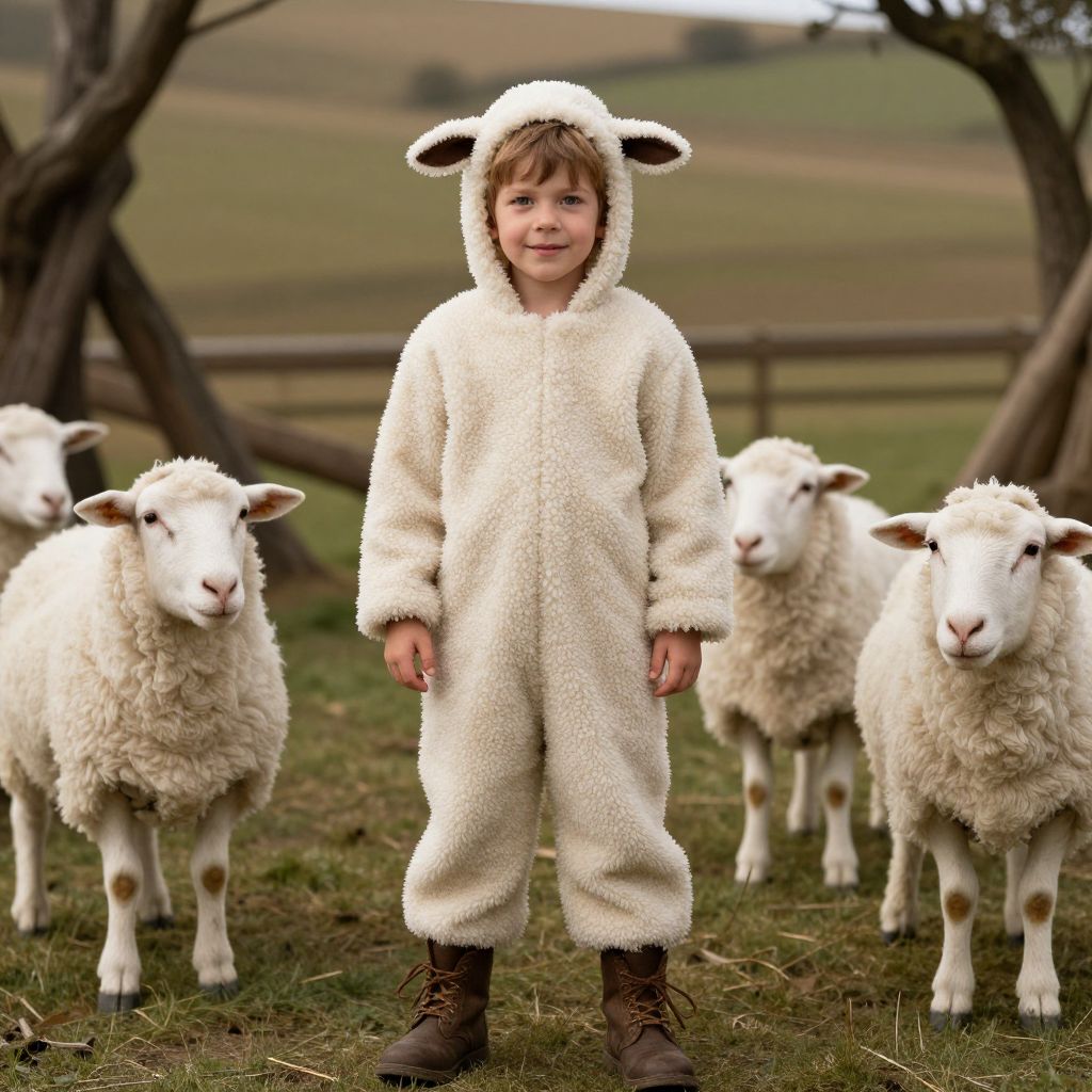 Sheep Costume Nativity, boy in a sheep outfit standing in a field with sheep