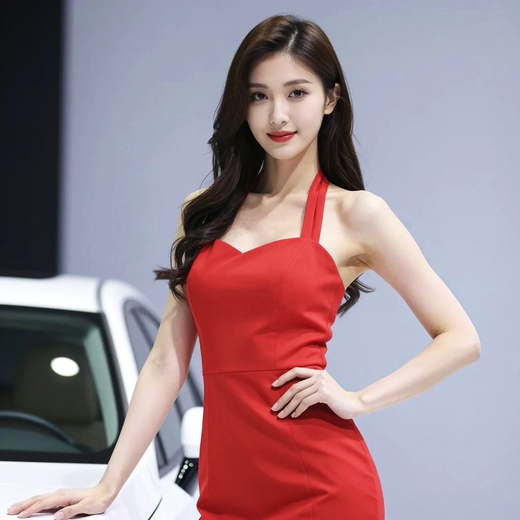 A confident young Asian woman posing against a dark gray background wearing a red sequin crop top with black trim and studded details, paired with a shimmering black skirt featuring a bright blue reflective hem and red lining. Her hair is styled in double buns tied with red ribbons. The outfit represents a modern, playful dance fashion look.